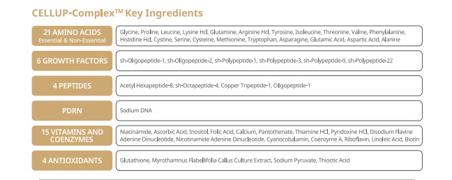 Formulated with Hyalusome™ and CELLUP-Complex™, a powerful combination of amino acids, growth factors, peptides, PDRN, vitamins, coenzymes and antioxidants to improve skin hydration, texture, and elasticity.